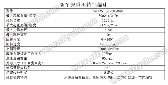凈功率206kw; 起重機(jī)型號(hào)為:SQ302Z(帶液壓油箱),起重機(jī)質(zhì)量為:1200kg,最大額定超升載荷為:3000kg. 側(cè)防護(hù)金屬材料Q235斷面槽形,螺栓連接,斷面高度40mm,離地高度450mm; 后防護(hù)金屬材料Q235斷面槽形,螺栓連接,斷面高度135mm,離地高度500mm; 安裝具有衛(wèi)星定位功能行駛記錄儀,東風(fēng)越野隨車吊:www.bell-lasers.com 吊機(jī)詳細(xì)參數(shù):