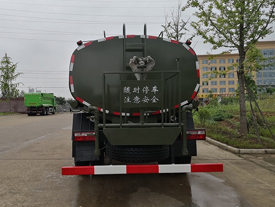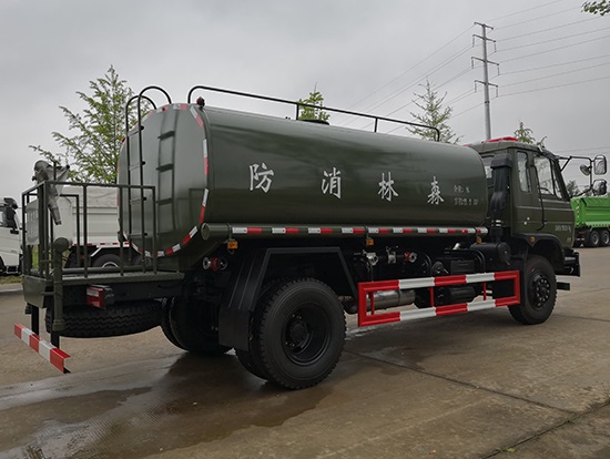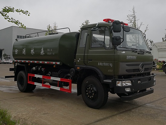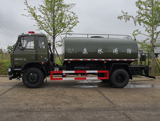 采用東風(fēng)EQ2180GD5DJ型越野汽車底盤,東風(fēng)一排半寬體駕駛室,4×4驅(qū)動,康明斯ISB190 50國五發(fā)動機(jī),六檔變速箱,東風(fēng)商用車橋,前驅(qū)動橋3.8噸,后橋10噸,10.00R20輪胎,軸距4500mm,電動玻璃,方向助力,斷氣剎,ABS。罐體采用優(yōu)質(zhì)碳鋼QB235板材,板材厚度4mm,罐體容積11.1立方,變速箱安裝取力器,大功率水泵可泵進(jìn)泵出,后置工作平臺帶水炮射程25米,消防栓接口左右各一個(gè),選裝駕駛室頂部安裝長條警燈帶喊話器,全車顏色軍綠,兩側(cè)噴涂白色森林消防字樣。