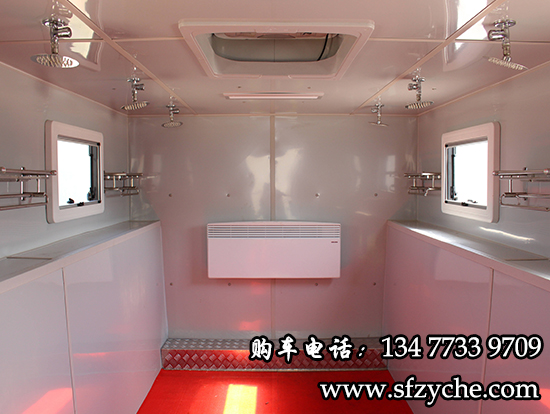車內(nèi)共分三個(gè)區(qū)域:鍋爐設(shè)備區(qū)、淋浴區(qū)、更衣區(qū);鍋爐設(shè)備區(qū)有熱水鍋爐,發(fā)電機(jī)、水箱等設(shè)備;更衣區(qū)設(shè)置更衣柜,穿衣凳和空調(diào)暖風(fēng)設(shè)備,在這里更換衣物等;在更衣區(qū)頂部設(shè)備頂置空調(diào) ,確保人員在更換衣服時(shí)的室內(nèi)溫度暖和;淋浴區(qū)設(shè)置 8個(gè)淋浴花灑,可供 8人同時(shí)淋。黄漤敳堪惭b暖風(fēng)和換氣設(shè)備,保證淋浴時(shí)的室內(nèi)溫度及空氣環(huán)境等。
