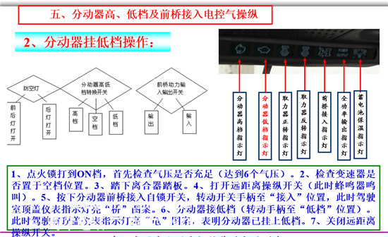 1、點(diǎn)火鎖打到ON檔,首先檢查氣壓是否充足(達(dá)到6個(gè)氣壓)。2、檢查變速器是否置于空檔位置。3、踏下離合器踏板。4、打開(kāi)遠(yuǎn)距離操縱開(kāi)關(guān)(此時(shí)蜂鳴器鳴叫)。5、按下分動(dòng)器前橋接入自鎖開(kāi)關(guān),轉(zhuǎn)動(dòng)開(kāi)關(guān)手柄至“接入”位置,此時(shí)駕駛室頂蓋儀表指示燈亮“橋”圖案。6、分動(dòng)器接低檔(轉(zhuǎn)動(dòng)手柄至“低檔”位置)。此時(shí)駕駛室頂蓋儀表指示燈亮“龜”圖案,表明分動(dòng)器已掛上低檔。7、關(guān)閉遠(yuǎn)距離操縱開(kāi)關(guān)。