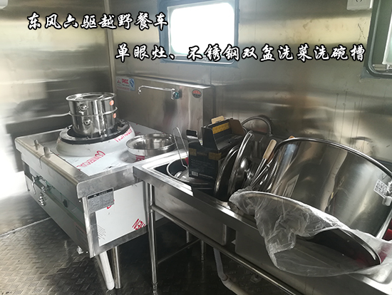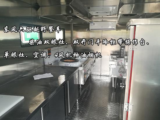 東風(fēng)六驅(qū)越野餐車(chē)車(chē)輛概述:采用東風(fēng)國(guó)五越野底盤(pán)改裝, 車(chē)廂材質(zhì)采用外冷軋鋼板,內(nèi)飾不銹鋼,中間保溫層,隱藏式上車(chē)踏步,頂部安全窗,兩個(gè)副食灶,一個(gè)蒸飯車(chē),抽油煙機(jī),平冷柜,水路,電路,油路等。